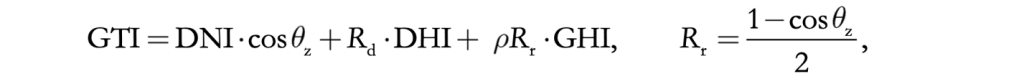 The second stage of the physical forecasting method consists in the transposition of GHI into values of total solar irradiance (GTI – Global Tilted Irradiance) on an arbitrarily oriented and tilted surface, as the tilt angle of PV modules is typically non-zero. These transposition models are based on the output parameters obtained from the previous step—namely, BHI and DHI: