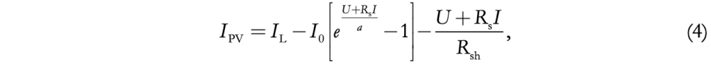 where IL is the photocurrent, which directly depends on the effective value of GTI; I0 is the diode reverse saturation current; a = NkTPV cell (where N is the diode ideality factor, k is Boltzmann’s constant [1.380649⋅10−23 J/K]; Rs and Rsh are the shunt resistance and series resistance, respectively.
