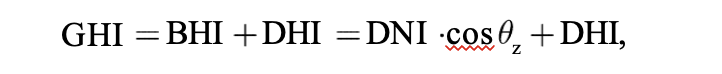 The decomposition of GHI into its direct (BHI – Beam Horizontal Irradiance) and diffuse (DHI – Diffuse Horizontal Irradiance) components is performed using appropriate decomposition models. These quantities are interrelated through the following expression: